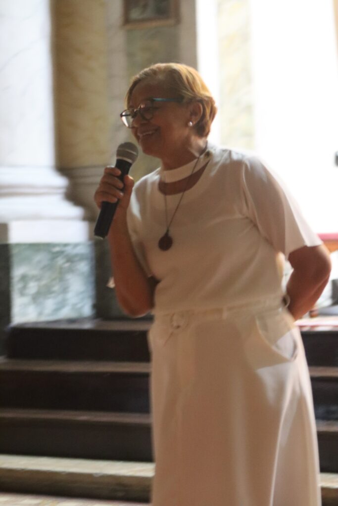 Num retiro em 2011, eu não queria ir, me levaram. Tive um momento de adoração, formação e acompanhamento. Três da manhã eu estava sendo acompanhada. Eu tava cega, desesperada. Aí eu vi o Senhor. A irmã Maria Sara me deu uma Palavra: Coríntios — “ai de ti se não evangelizar”. Eu me encontrei nessa Palavra.