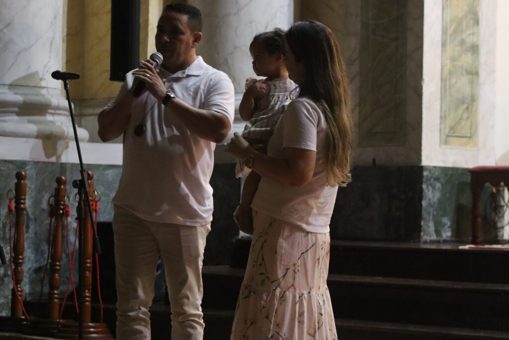 “Somos Geysiane e Gileno. Temos três filhos: um de 9, uma de 4 e a Maria Flor de 1 ano e 6 meses. Conhecemos a comunidade no retiro de 2011 para 2012. Em 2012 fiz meu ano sabático. Eu entrei com muitas expectativas: que o meu namorado fosse santo, que pudéssemos casar e formar uma família. Pequenas esperanças.